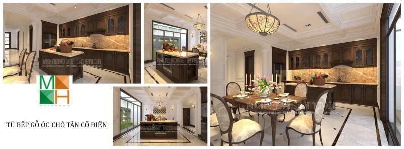 Thiết kế tủ bếp tân cổ điển bằng gỗ óc chó cho không gian nhỏ là việc vô cùng đơn giản với nội thất MoreHome, với hàng trăm mẫu thiết kế cùng đội ngũ tư vấn nhiệt tình sẽ giúp bạn lựa chọn được mẫu tủ bếp ưng ý nhất