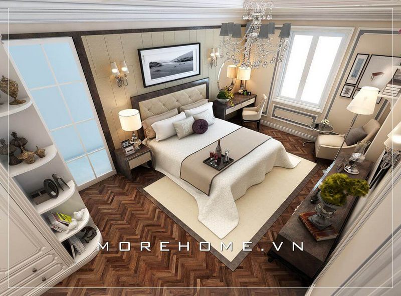 Thiết kế phòng ngủ nhỏ ấn tượng với nội thất giường ngủ tân cổ điển bọc da đầu giường sang trọng