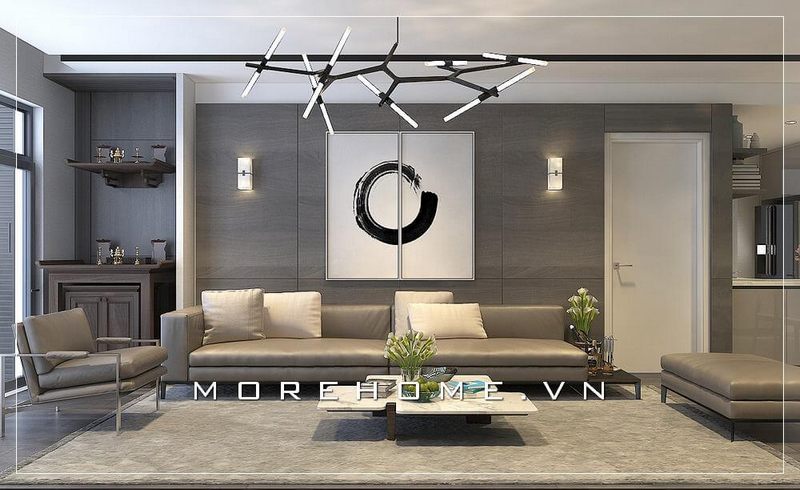 Không gian phòng khách căn hộ chung cư đầy ấn tượng từ bộ sofa văng phong cách hiện đại bọc da màu ghi sang trọng và tiện nghi.