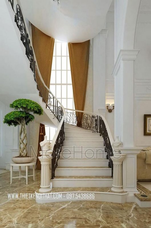 Mẫu cầu thang tay vịn gỗ song sắt tân cổ điển được thiết kế để tạo nên sự sang trọng tại biệt thự An Giang.